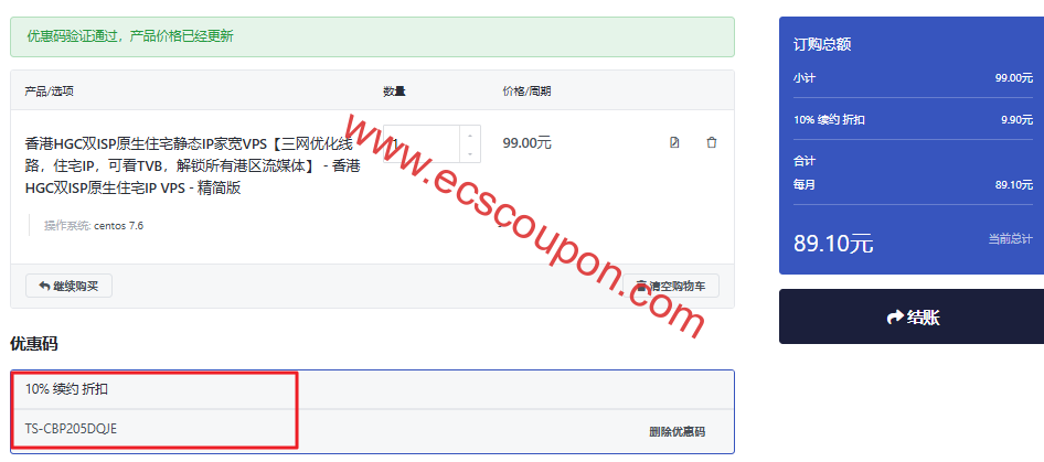 步骤2、丽萨主机优惠码输入完成之后,点击验证按钮确认该优惠码是否有效,一定要点击验证按钮,否则优惠码不会应用,无法生效。如果优惠码有效,则会显示相应的优惠金额,如下图所示: