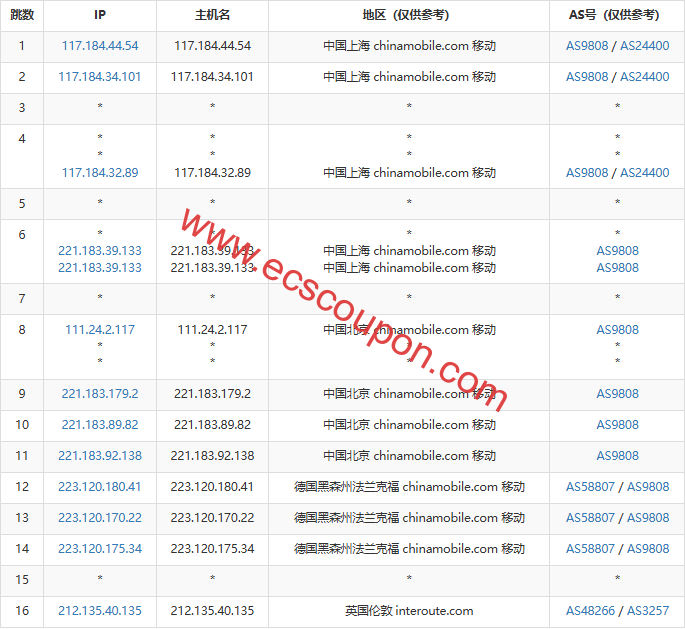 移动去程路由节点测试,移动CMI直连德国法兰克福节点,然后到达英国机房: